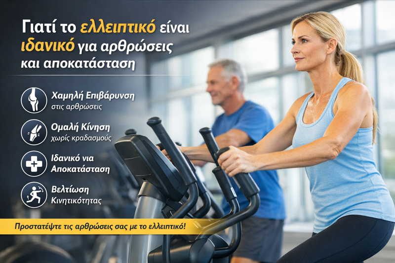 Το ελλειπτικό μηχάνημα συνδυάζει αποτελεσματική άσκηση, προστασία των αρθρώσεων και δυνατότητα αποκατάστασης. Αν αναζητάτε έναν ασφαλή και αποδοτικό τρόπο άσκησης, το ελλειπτικό αποτελεί μία επένδυση στην υγεία και την ποιότητα ζωής σας.