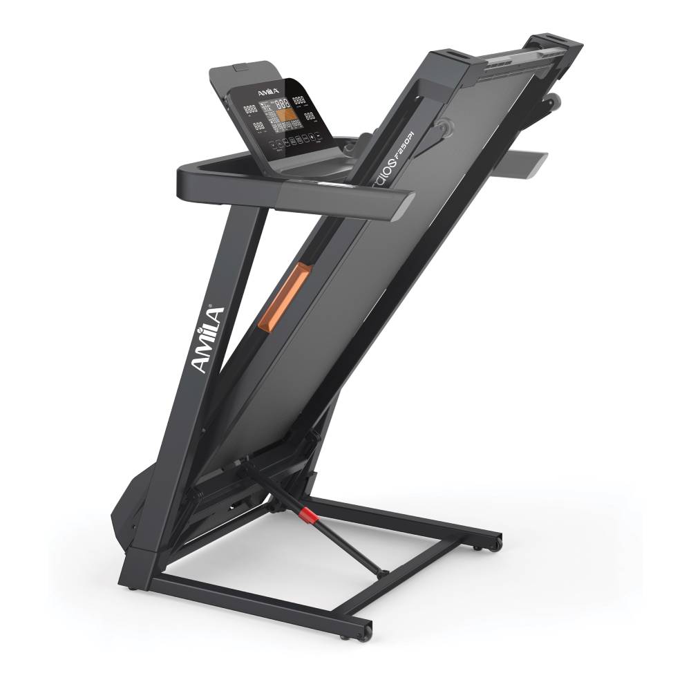 Όπως όλοι οι οικιακοί διάδρομοι AMILA έτσι και ο Kalos F250PI διαθέτει ένα σύστημα αναδίπλωσης που σας επιτρέπει να τον αναδιπλώσετε ώστε να τον μετακινήσετε και να τον αποθηκεύσετε εύκολα. Με τη βοήθεια του αμορτισέρ ο διάδρομος αναδιπλώνεται εύκολα και κλειδώνει σε κάθετη θέση για να μειώσετε τον χώρο που καταλαμβάνει.