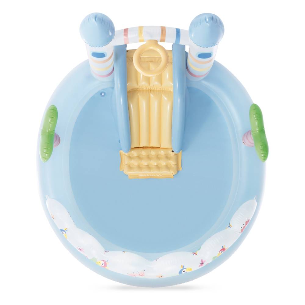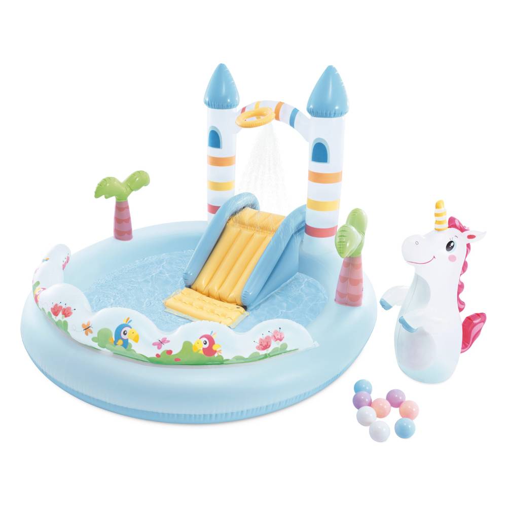 Φουσκωτή παιδική πισίνα παιδότοπος σε σχήμα μαγικού κάστρου μονόκερου. Περιλαμβάνει τσουλήθρα με επιπλέον επένδυση στην περιοχή προσγείωσης και αψίδα σε σχήμα κάστρου που γίνεται ένα ευχάριστο ντους όταν συνδέεται με το λάστιχο του κήπου. Περιλαμβάνεται επίσης ένας σάκος μποξ Bop bag σε σχήμα μονόκερου και 8 μπάλες που μπορούν να πεταχτούν μέσα από ένα στεφάνι στην αψίδα του κάστρου. Εξοπλισμένο με βαλβίδα αποστράγγισης. Για παιδιά 2 ετών και άνω.