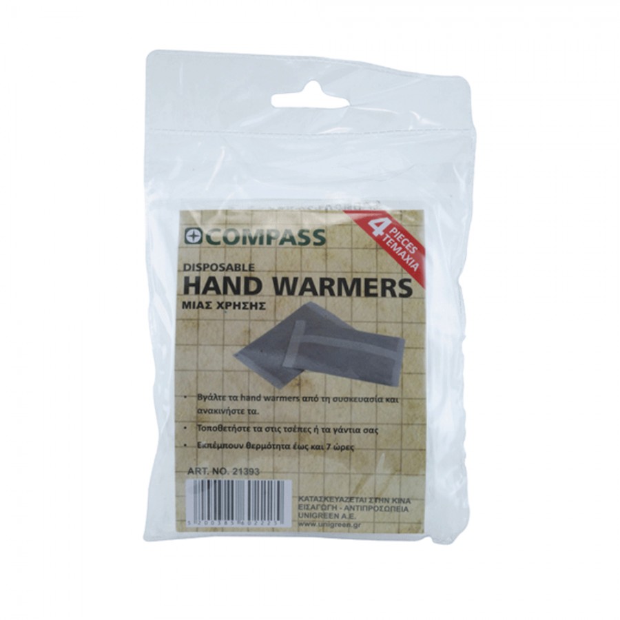 Τα Hand Warmer της Compass είναι ένα απαραίτητο αξεσουάρ για ορειβάτες αλλά και για εκείνους που κάνουν καταδύσεις , αφού εκπέμπουν θερμοκρασία ως και εφτά ώρες κι έτσι κρατάνε τα χέρια σας ζεστά. Το σετ περιέχει 4 τεμάχια.