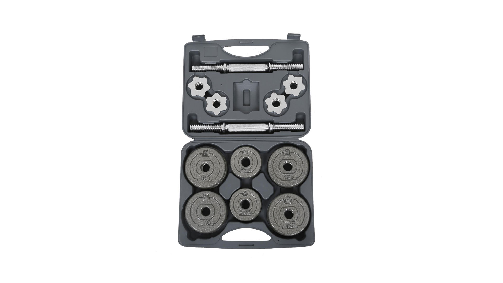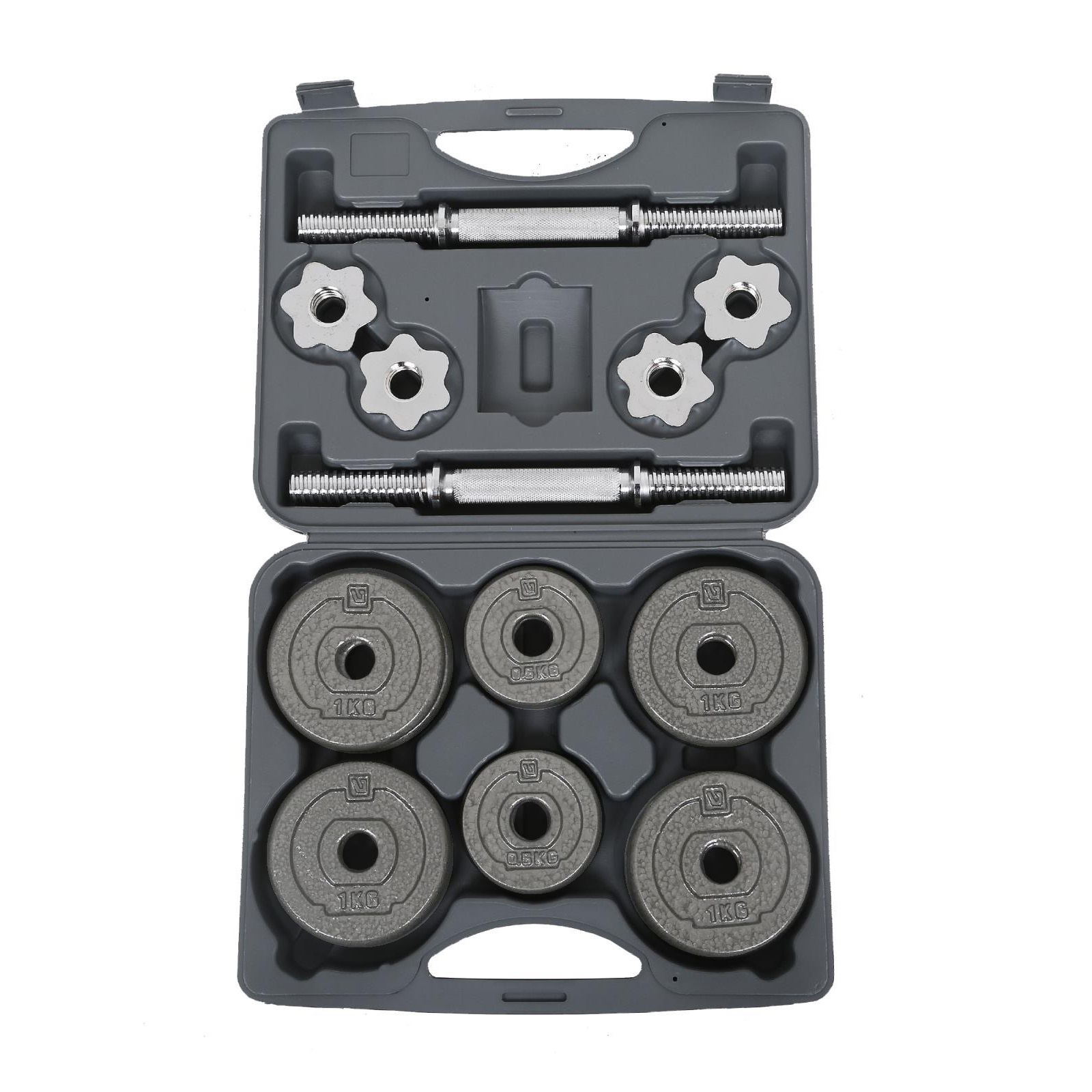 Σετ αλτήρα 15kg χρωμιωμένο σε βαλιτσάκι μεταφοράς για να το μεταφέρεται εύκολα παντού αλλά και να είναι αποθηκευμένα όταν δεν τα χρησιμοποιείται. Αποτελείται από 2 αλτήρα χρωμιωμένο, 4 x 0.5kg δίσκους μεταλλικούς και 8 x 1kg δίσκους μεταλλικούς και 2 σφιγκτήρες βιδωτούς. Μπορείτε να εκτελέσετε πλήθος ασκήσεων, για τα χέρια, το στήθος, τη πλάτη. Ένα mini γυμναστήριο στη βαλίτσα σας που μπορείτε να το έχετε παντού και σε λίγα λεπτά να είναι έτοιμο για χρήση.