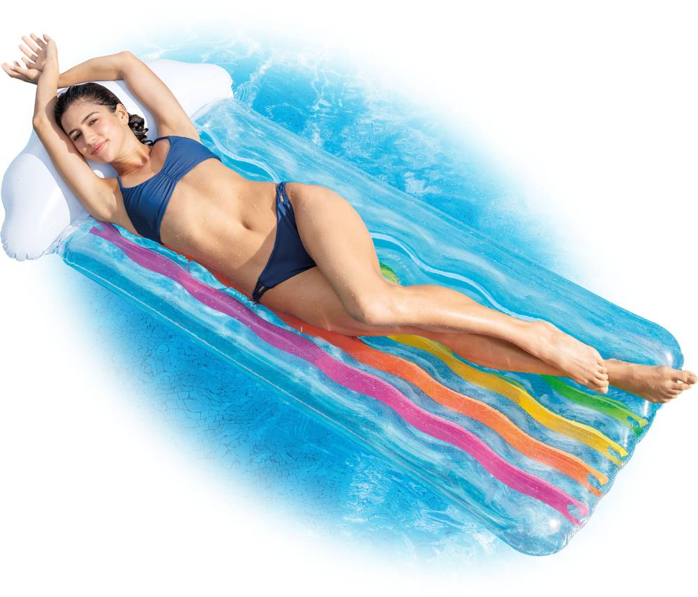 Φουσκωτό στρώμα της Intex ιδανικό για να απολαμβάνετε ξέγνοιαστες στιγμές χαλάρωσης στο νερό μαζί με την παρέα σας. Διάφανο PVC με πολύχρωμες λωρίδες εσωτερικά και ενσωματωμένο μαξιλάρι. Είναι κατασκευασμένο από βινύλιο για μέγιστη αντοχή σε βάρος έως 100 κιλά.