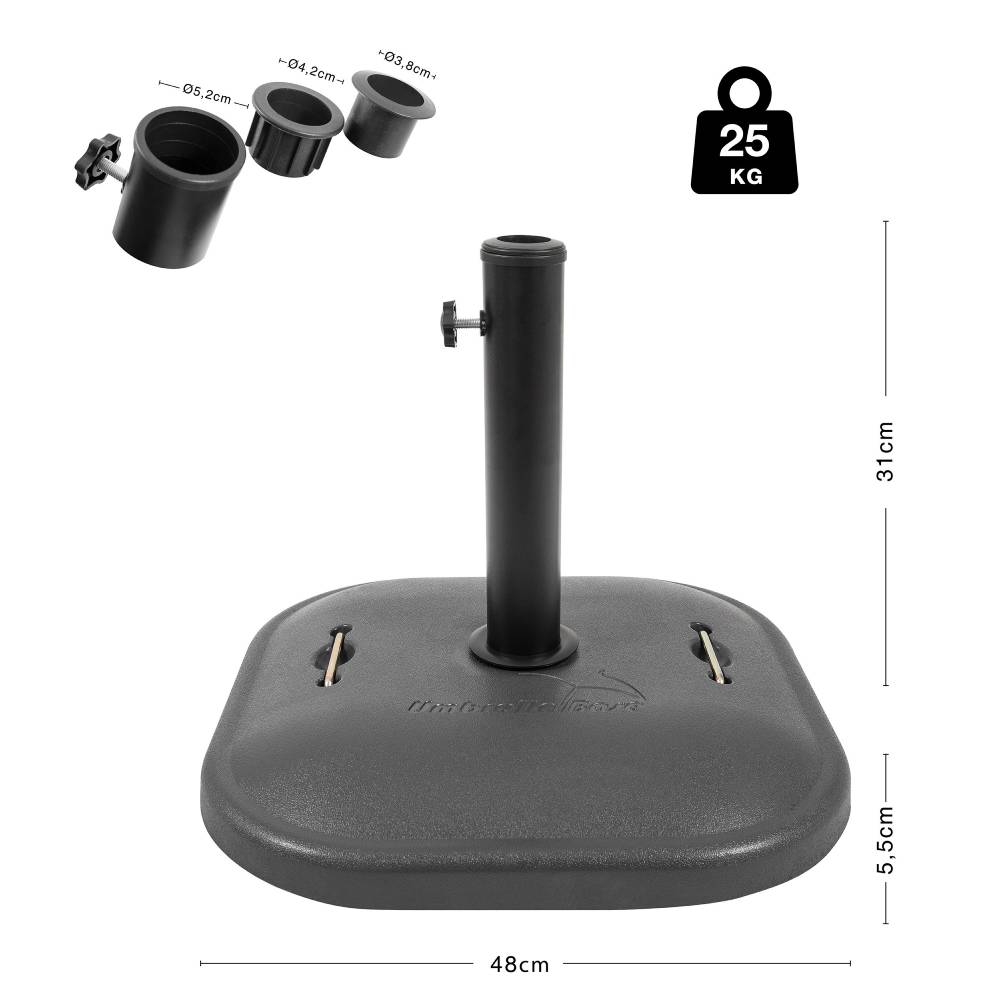 Βάση Ομπρέλας κήπου βεράντας Escape 12281 κατασκευασμένη από τσιμέντο με βάρος 25 κιλά, προσφέρει μέγιστη αντοχή στις καιρικές συνθήκες και στον αέρα, εξασφαλίζοντας την καλύτερη στήριξη της ομπρέλας σας. Κατάλληλη για ομπρέλες έως 3 μέτρα. Διαθέτει χειρολαβές για εύκολη μετακίνηση.