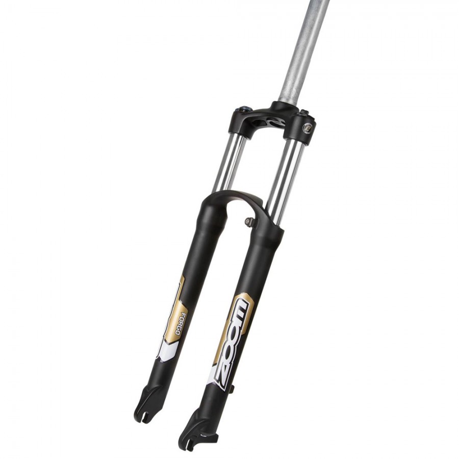 Εμπρόσθια ανάρτηση ποδηλάτου από την Zoom με διαδρομή 100mm. Για την απόσβεση των ανωμαλιών του εδάφους και την συνεχή επαφή του τροχού με το έδαφος χρησιμοποιεί την τεχνολογία ελαστομερή και σπειροειδή ελατήρια. Διαθέτει ρύθμιση προφόρτισης και κλείδωμα ανάρτησης. Είναι ιδανική για ποδήλατα με τροχό 26" που διαθέτουν δισκόφρενα.