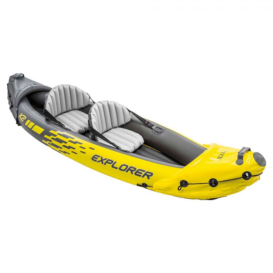 Το φουσκωτό κανό καγιάκ Intex Explorer K2 διαθέτει σπορτίφ και αθλητικό σχεδιασμό για υψηλή ορατότητα. Το προφίλ του είναι χαμηλό που ευνοεί τη χρήση και σε λίμνες και μεσαία ποτάμια. Προσφέρει εξαιρετική άνεση για δύο (2) άτομα με καθίσματα φουσκωτά με πλάτη. Κατασκευάζεται από ενισχυμένο βινύλιο (PVC) πάχους 0,75mm και στον εξοπλισμό του περιλαμβάνει, σχοινί αρπαγής και στις δύο πλευρές, φουσκωτό I-beam πάτωμα, αφαιρούμενη τρόπιδα για καλύτερη ισορροπία στη πλεύση και χειρολαβές ανέλκυσης και στην πρύμνη και στη πλώρη. Στη συσκευασία περιλαμβάνονται: τρόμπα χειρός, ένα (2) κουπιά αλουμινίου και υλικά επιδιόρθωσης.