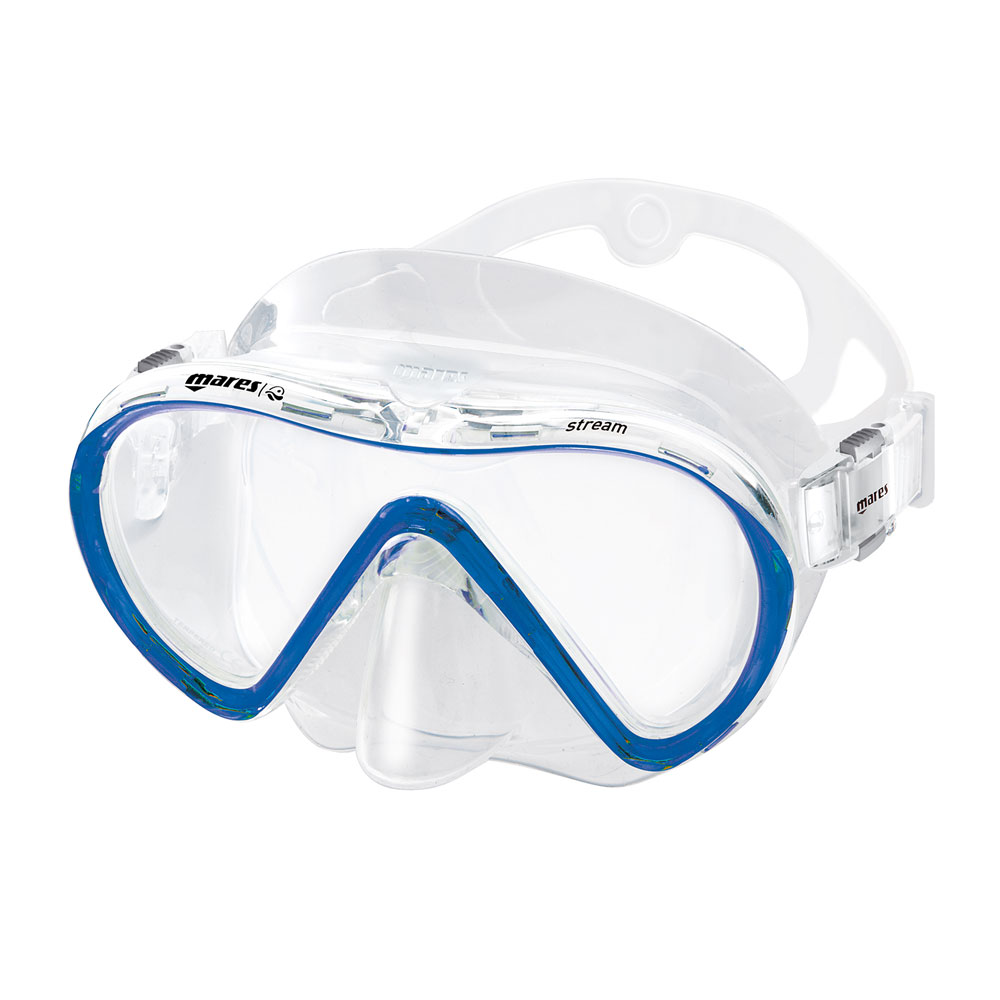 Η μάσκα Stream Clear Blue της Mares είναι σχετικά μεσαίου όγκου και είναι κατάλληλη για snorkeling και ελεύθερη κατάδυση. Η Stream γενικά είναι μια μάσκα υψηλής ποιότητας από μείγμα σιλικόνης siliter που εγγυάται την καλή εφαρμογή και στεγανότητα. Οι πόρπες για το λουράκι είναι ενσωματωμένες στη φούστα για καλύτερη σταθερότητα και ευκολία στη χρήση.